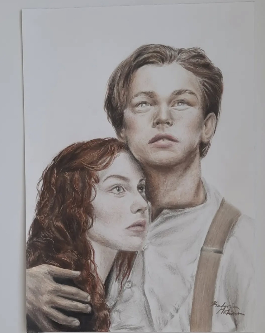 Puuväreillä tehty realistinen muotokuva Titanicin Jack ja Rose hahmoista. (myynnissä)