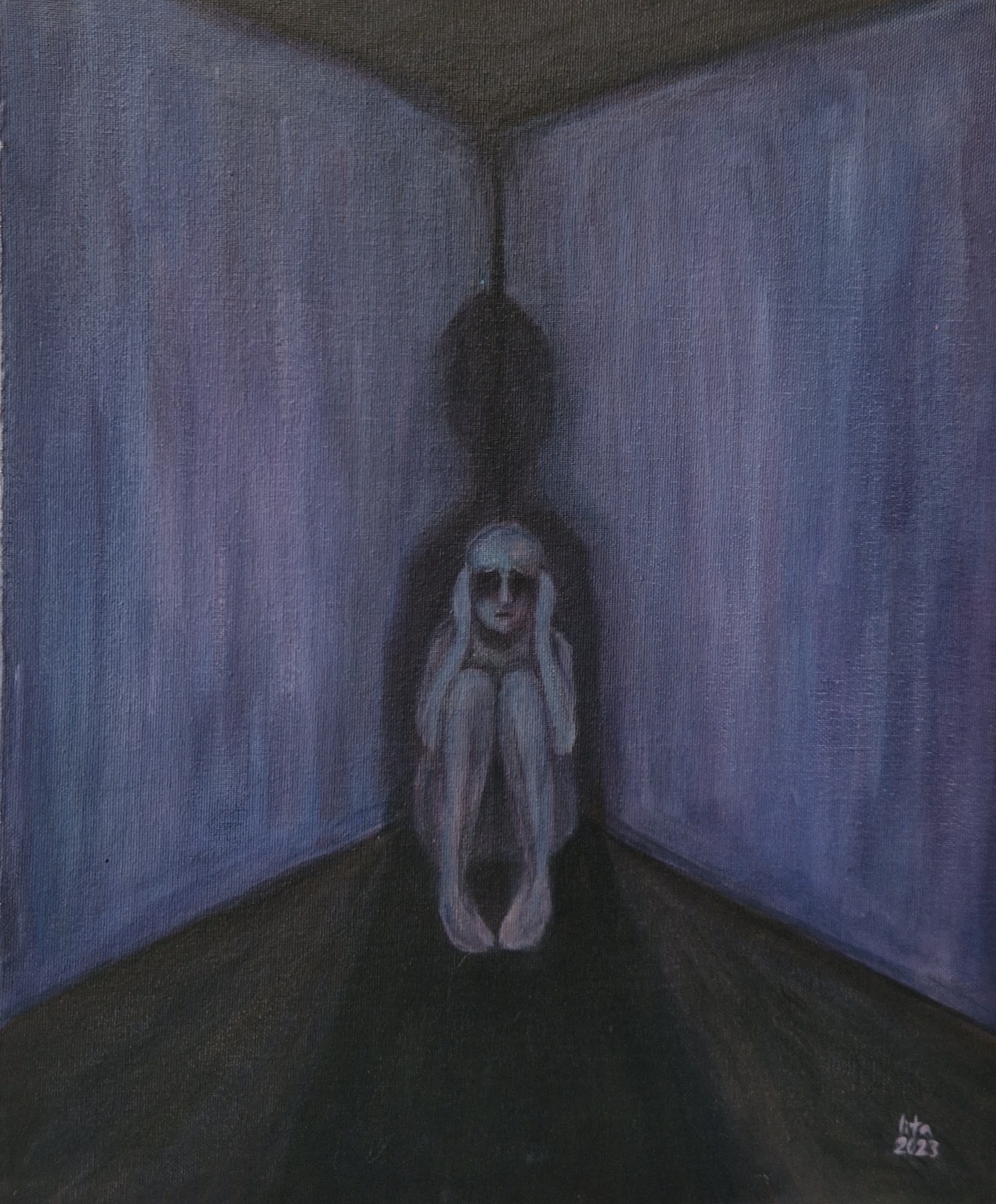 Syömishäiriö on kuin rinnalla kulkeva Peikko, joka langettaa ylle varjon minne meneekin. Peikko voi tuntua ja olla kuin ystävä, mutta todellisuudessa se kahlitsee kuin myrkylliseen parisuhteeseen ja tukahduttaa varjonsa alle sairastajan. Käsittelin teosta maalatessa omaa sairastumistani ja löysin sen kautta uutta voimaa taistella omaa Peikkoani vastaan.