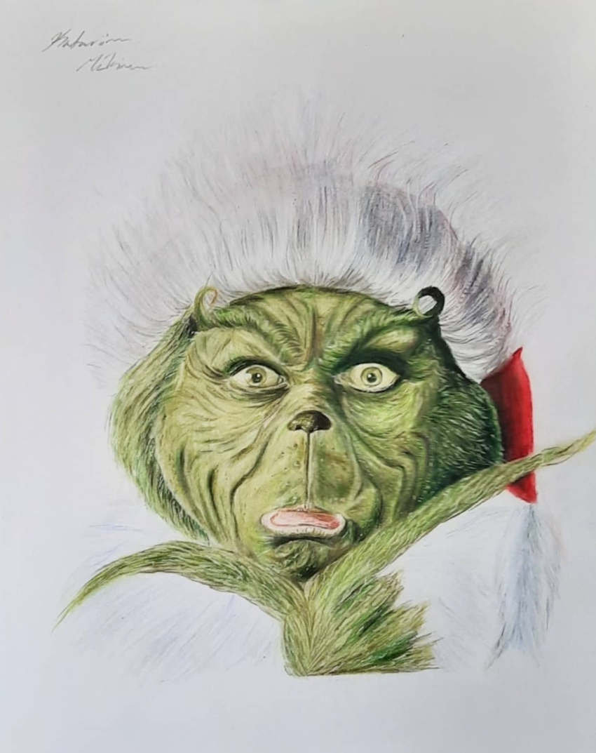 Puuväreillä tehty realistinen muotokuva the Grinch -hahmosta. (myynnissä)